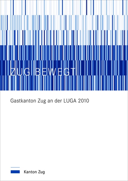 CD: Aussenhülle und Begleitkommunikation wurden unter strikter Einhaltung des CI des Kantons Zug realisiert. Als Grundlage diente das interaktive Zuger Panorama. Um der riesigen Fläche (32 bzw. 30x9 m) Leben einzuhauchen wurde jeder Farbbalken in je 3 waagrechte Bahnen eingeteilt. Die Farbgebung erfolgt in schmalen Streifen (6cm x 1m) mit 6 Farbnuancen, basierend auf dem Zuger Blau.